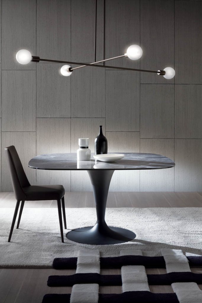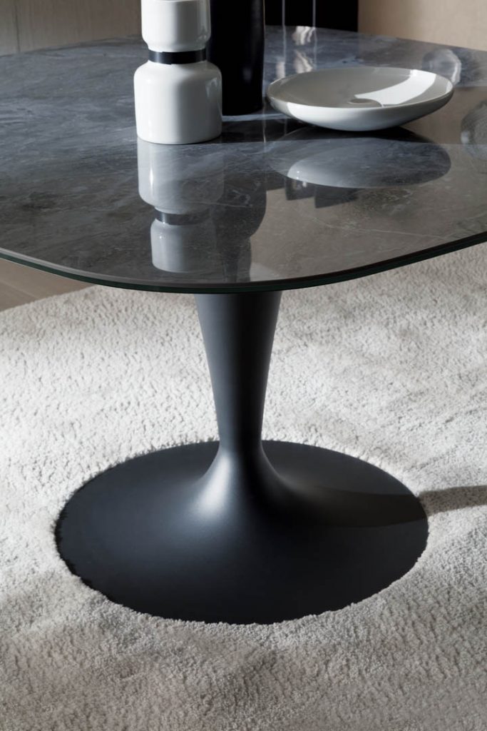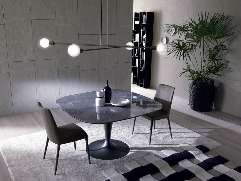 Soft lines that hide exceptional performances. Its natural presentation is recommended with chairs with soft and curved lines.