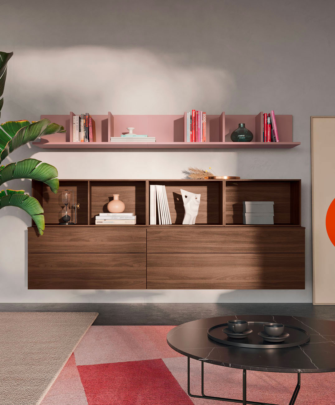 with suspended volumes and splashes of color that identify the function, in a dynamic and light context.