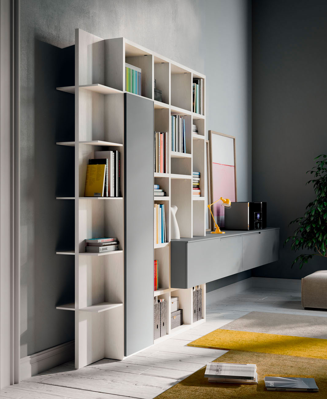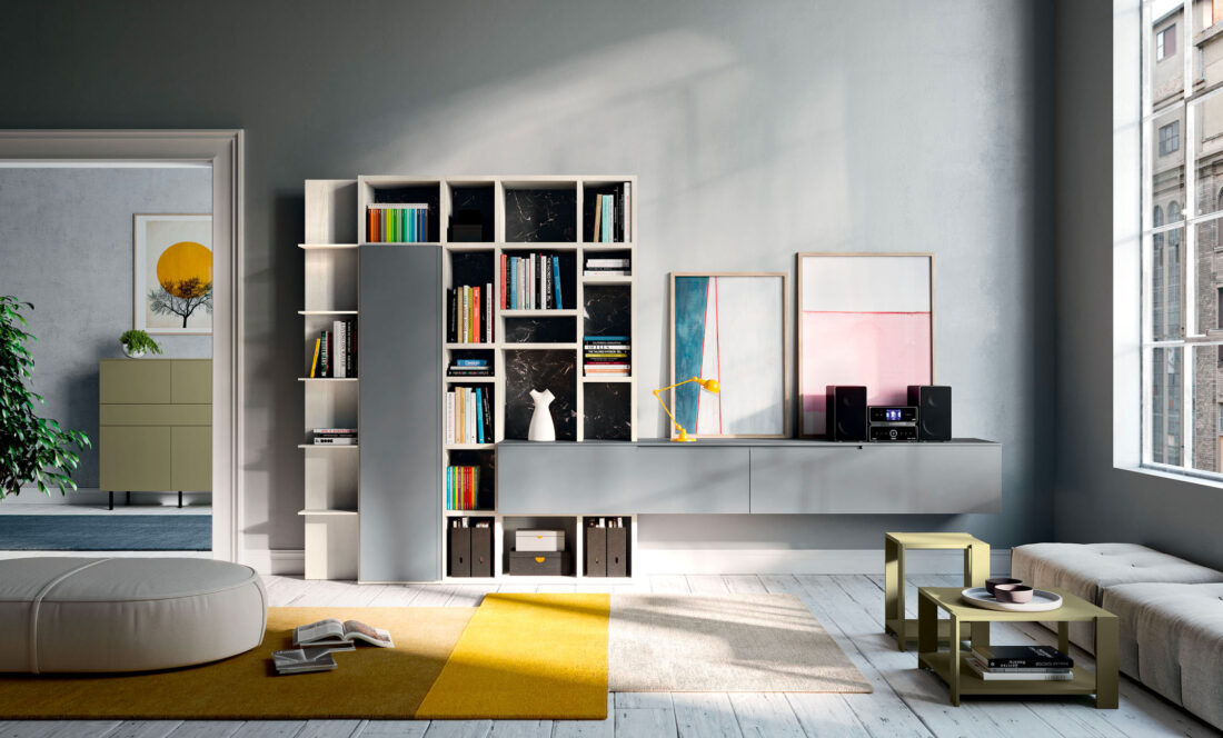 Thanks to a chromatic combination based on color contrasts, the supporting structure of the living area