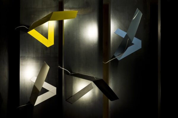 Materials Structure: folded metal painted in matt white, black, yellow and blue. Plug converter and on/off switch. In case of blown glass components, consult the quality section.
