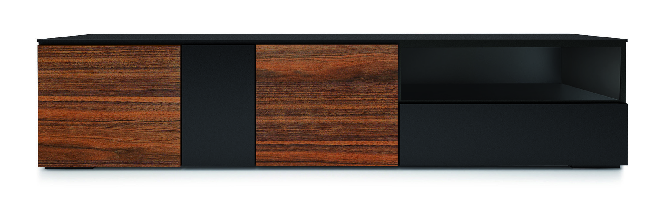 Matt lacquered TV bench with 3 doors, 1 flap door and 1 open compartment with lacquered/wooden doors