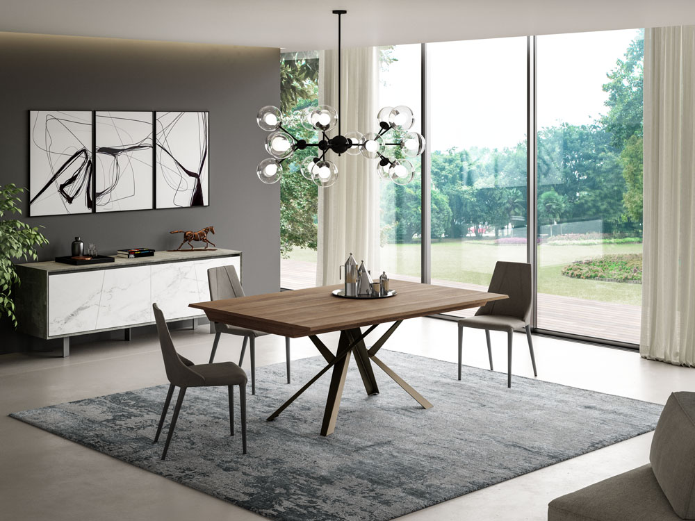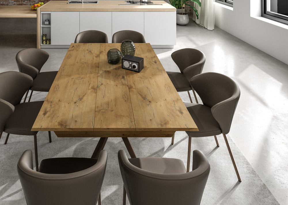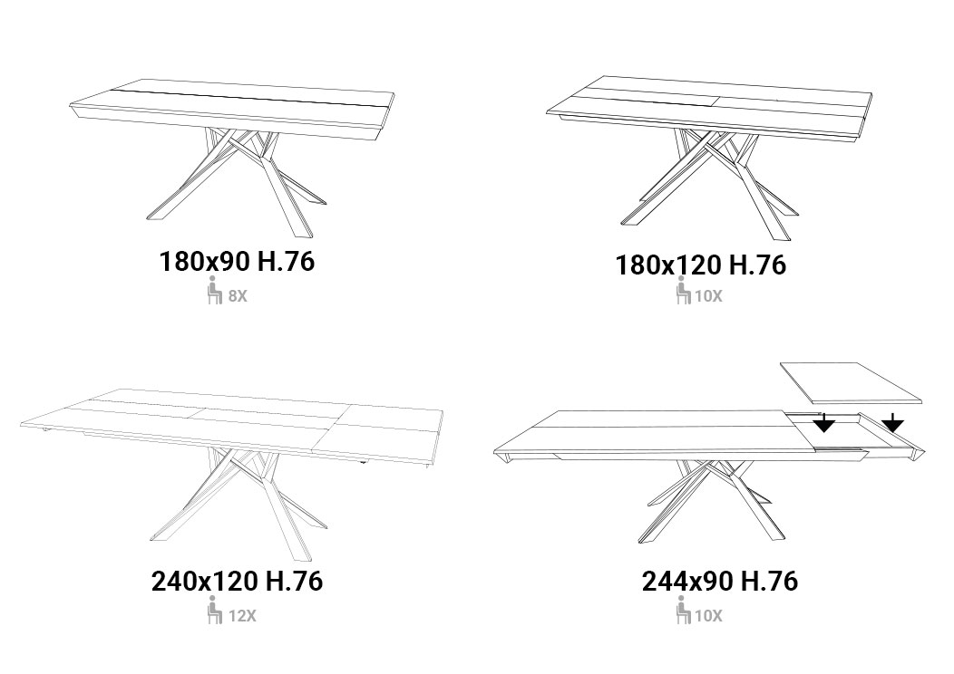 A table with many different uses, which top can be extended both in length and in width and several seat configurations. The opening is simple and fast, allows you to add many places to the table through independent extensions. Eco wood top, metal base and aluminium mechanism.
