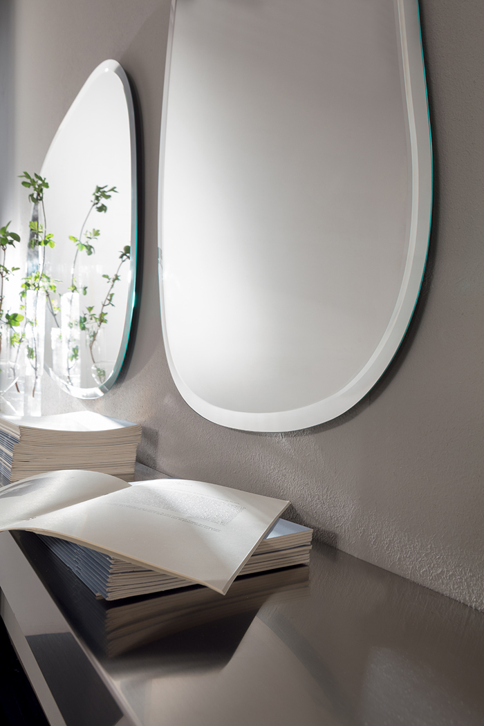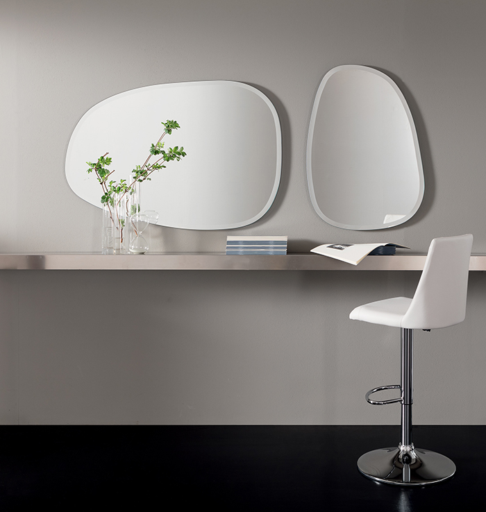 Mirror with chamfered edge, mountable in both horizontal and vertical position.