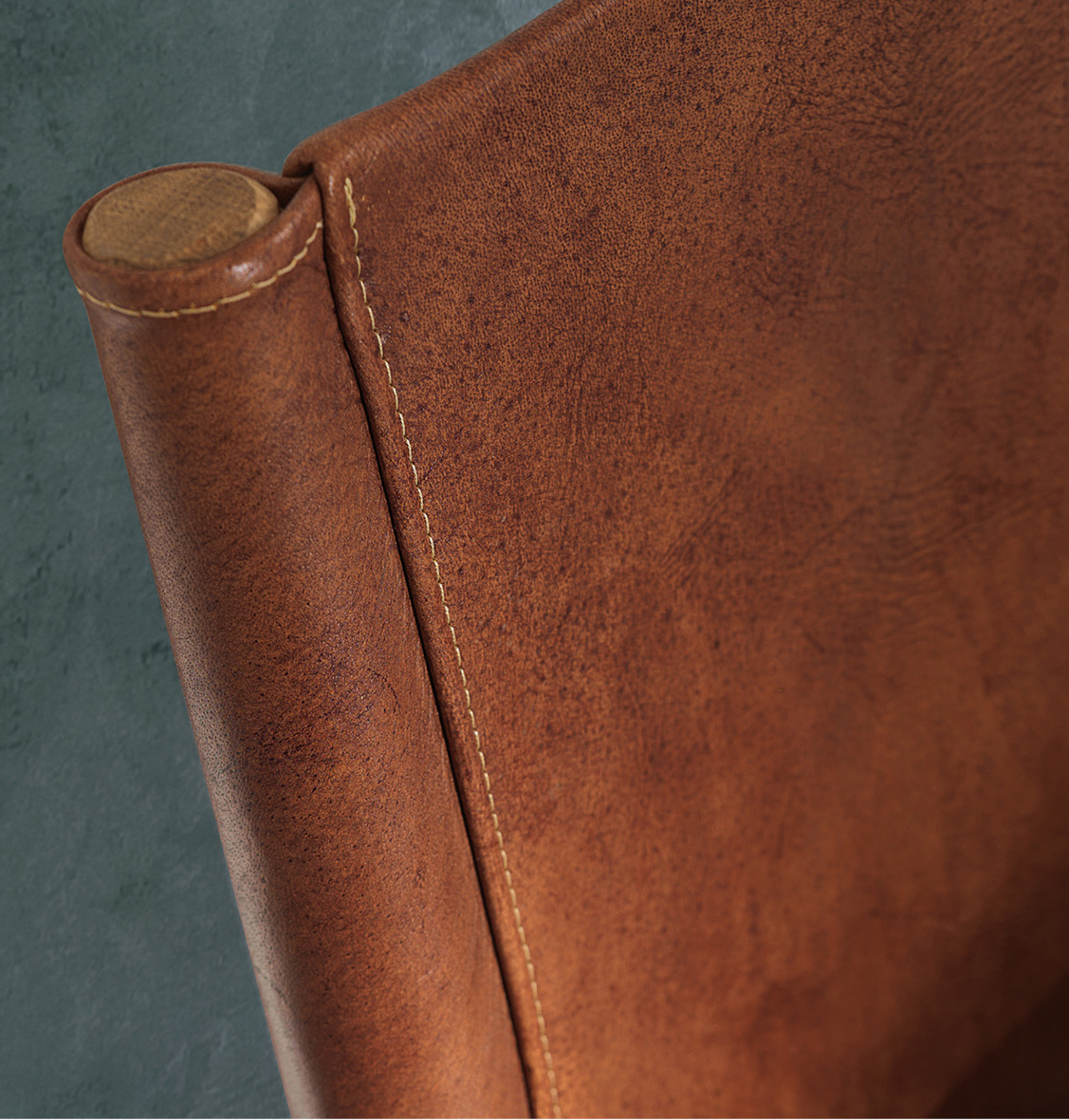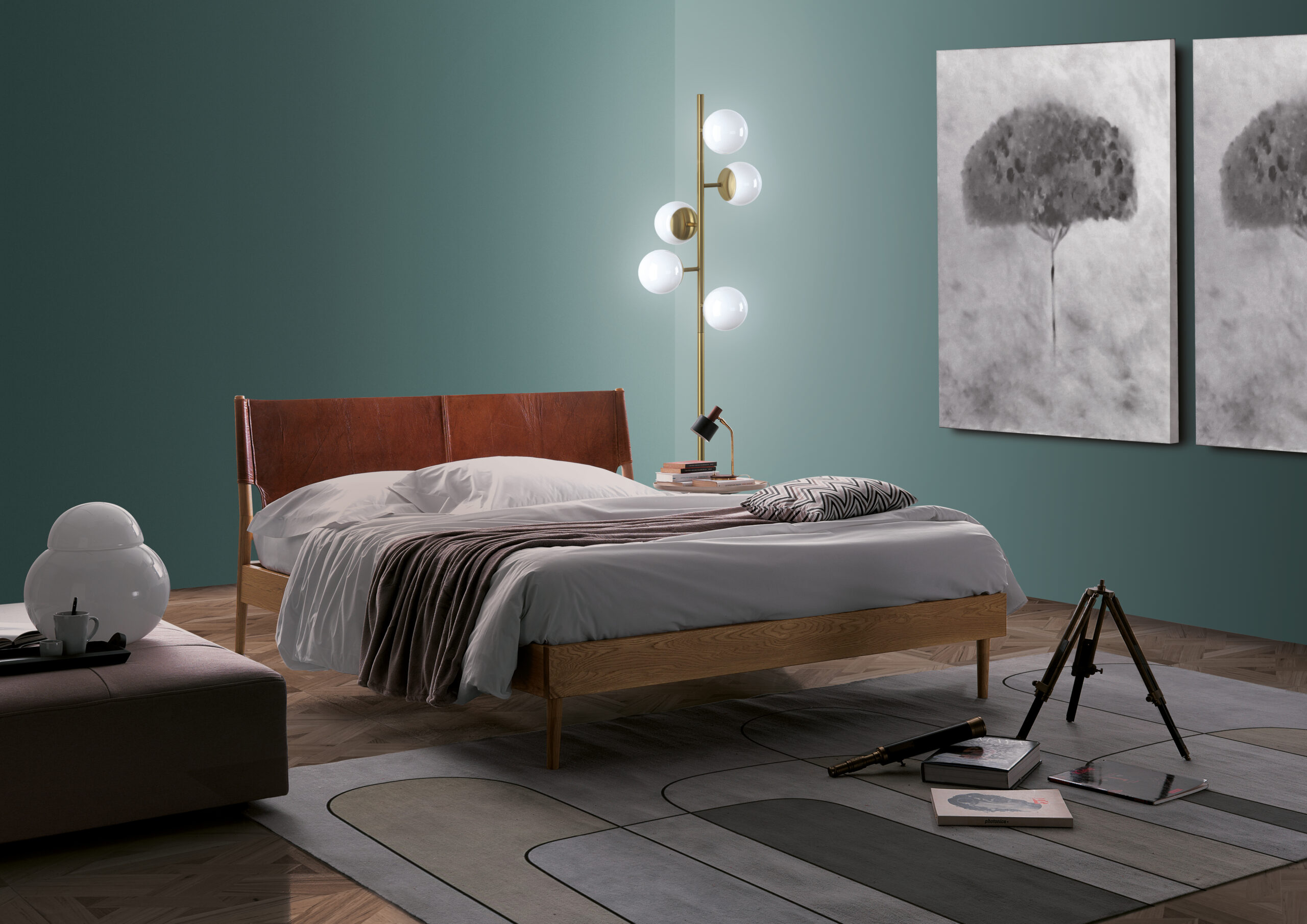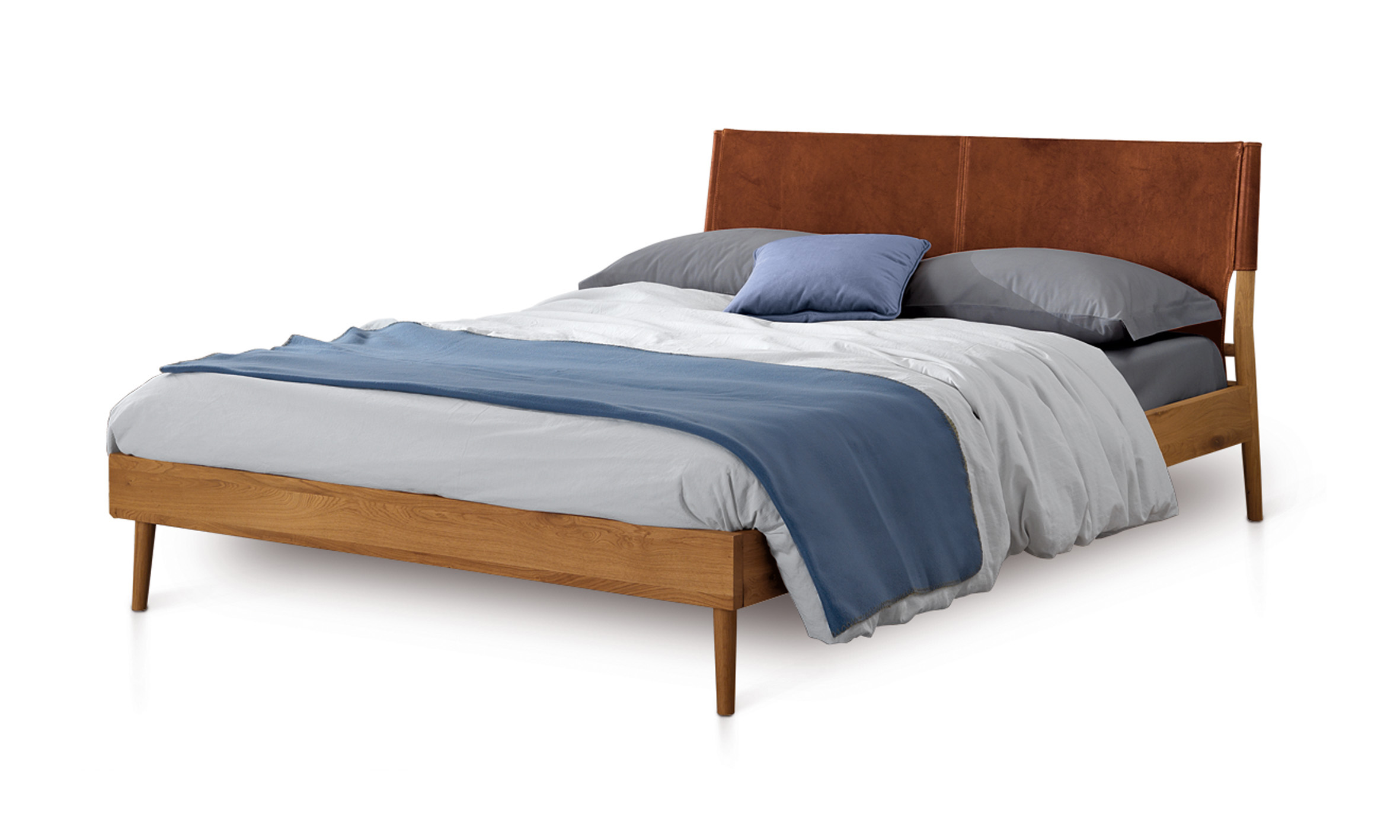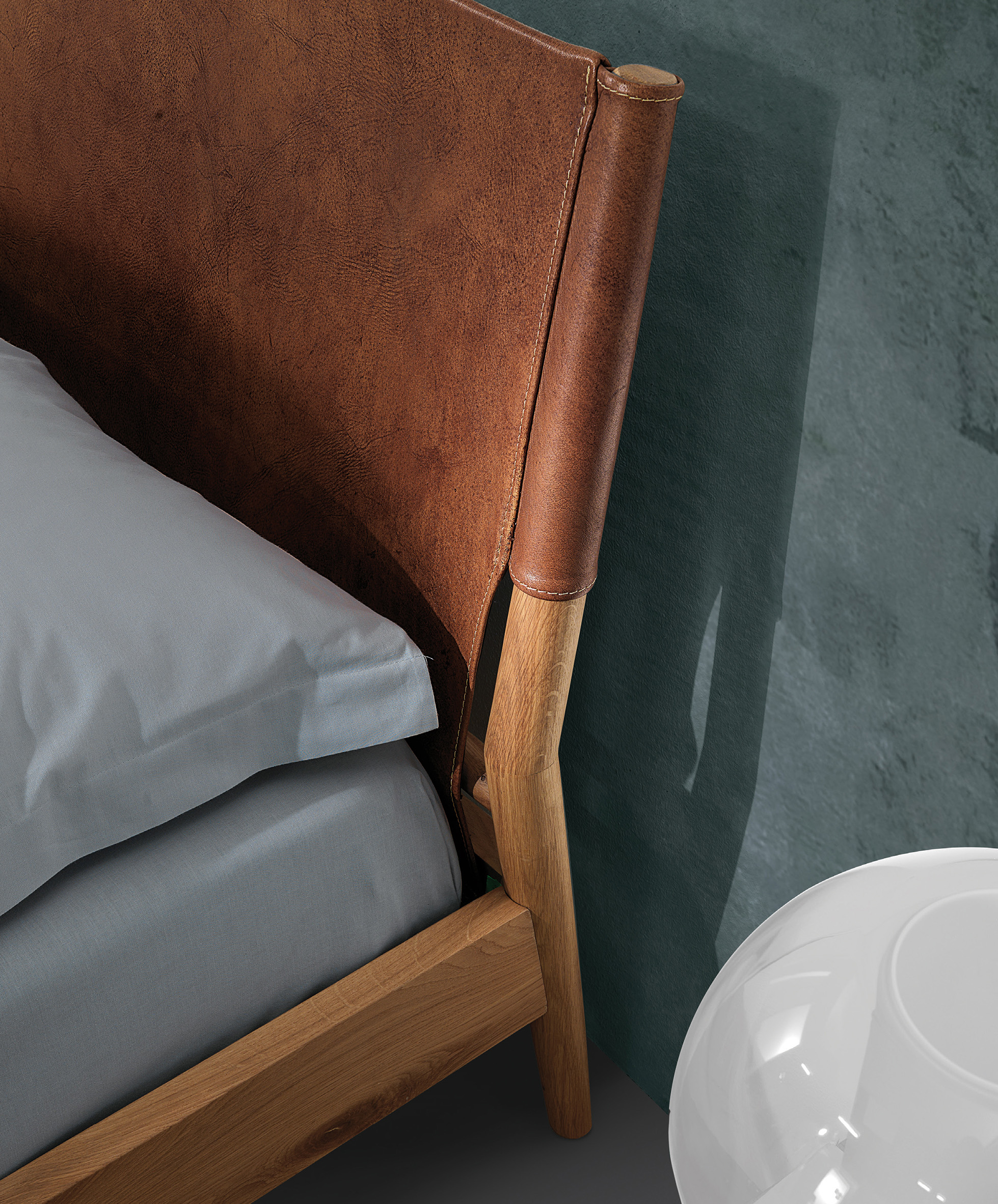 Nordic shapes and warm materials for Norway bed: leather and solid oak.