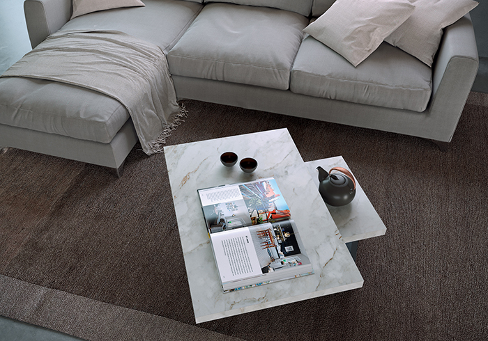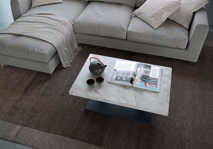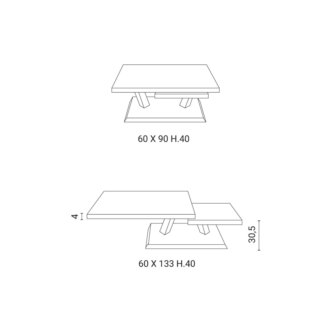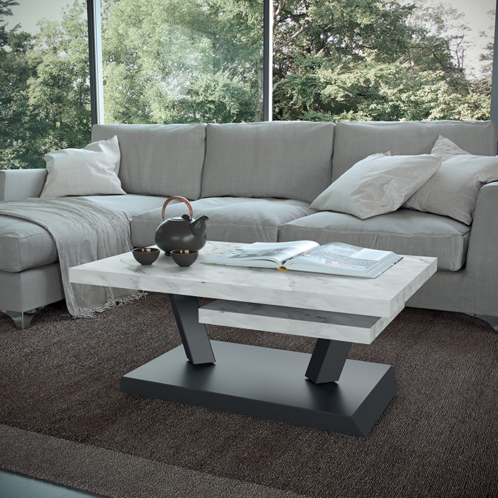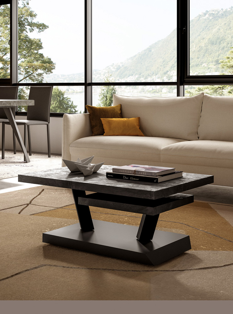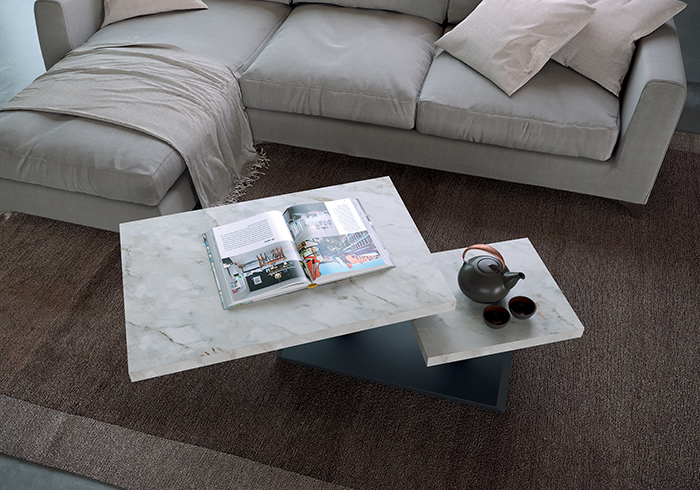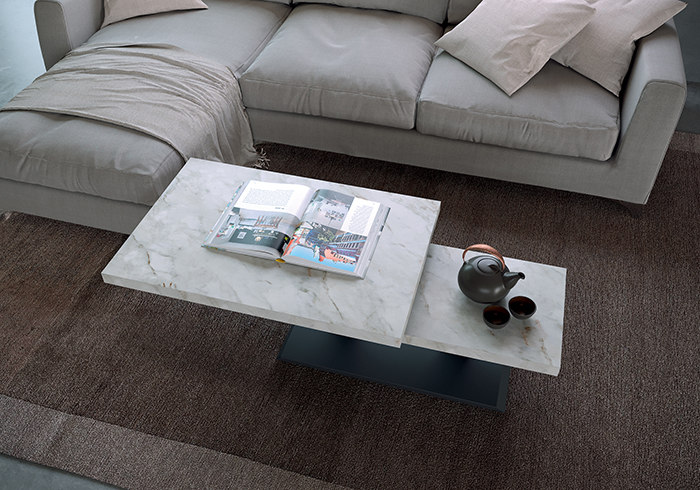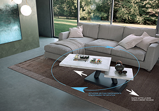 Coffee table with synchronised twisting tops. Dual eco-wood tops with folding edges.