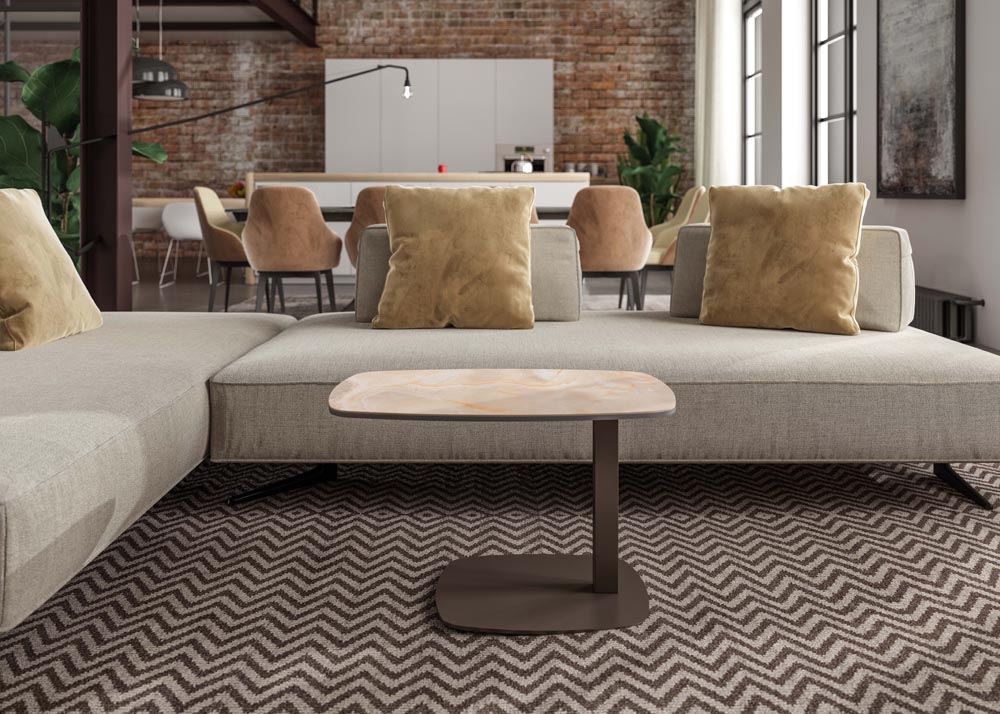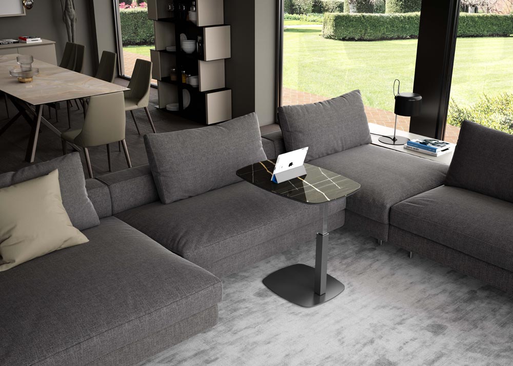 Height adjustable sofa side table. Shaped marble glass top (13mm). Metal structure bronze or graphite coating. Exclusive gas-braking piston system.