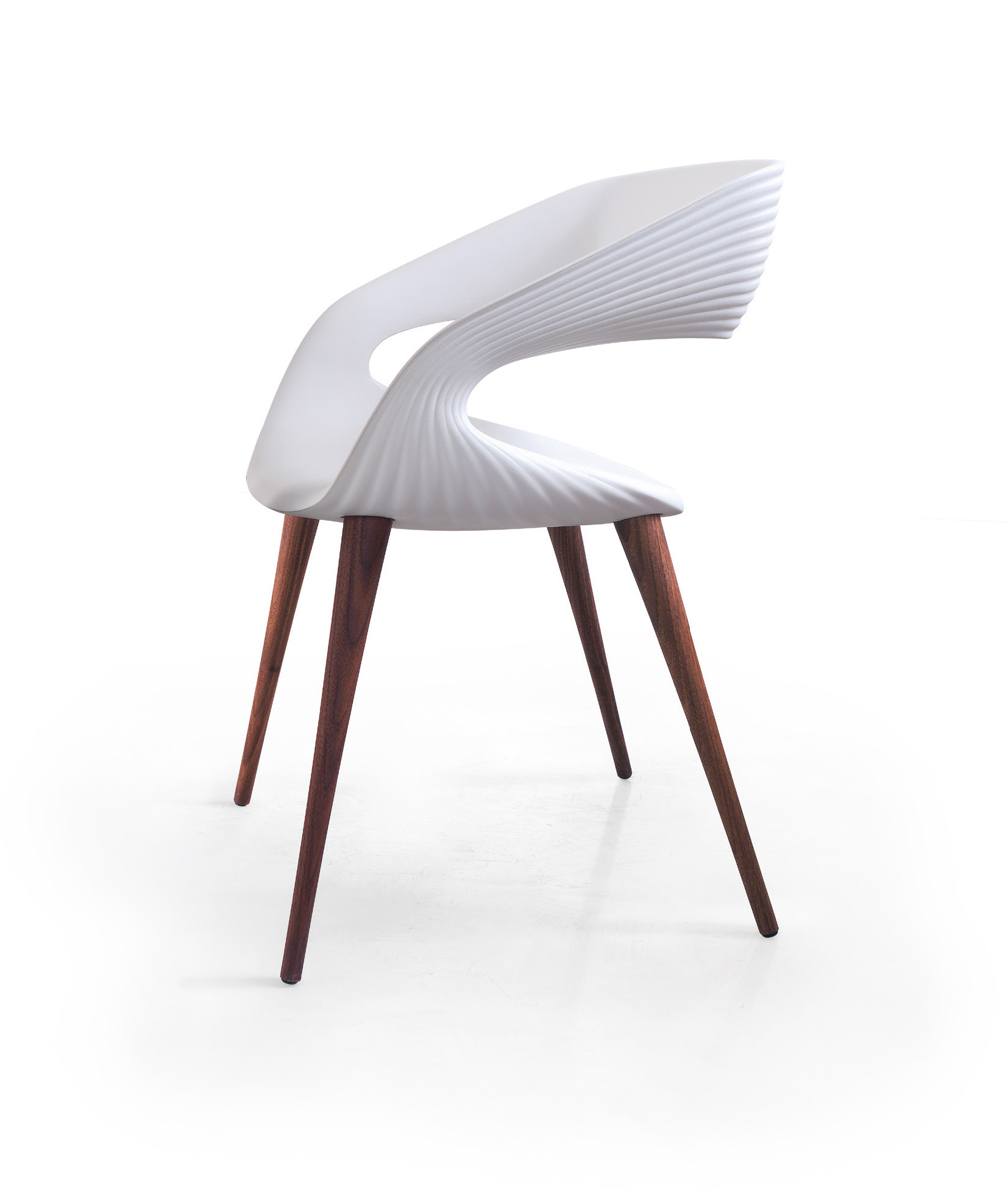 Chair with polyurethane shell and solid wood legs.