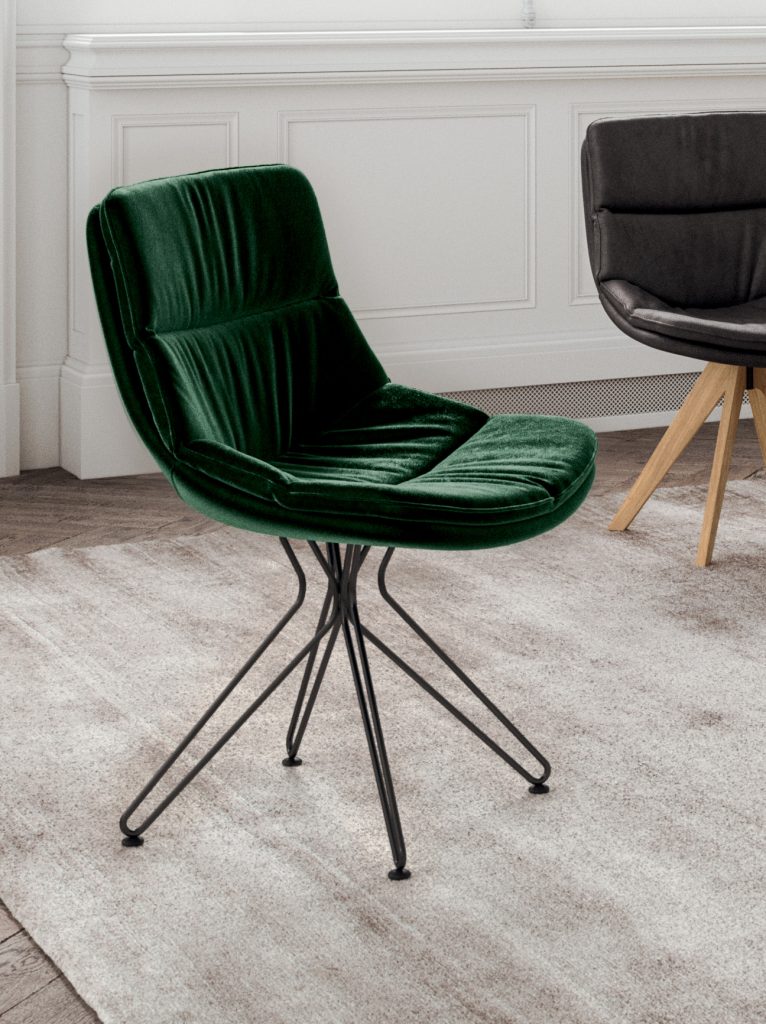Armchair with metal tube base, soft and enveloping seat in leather or velvet.