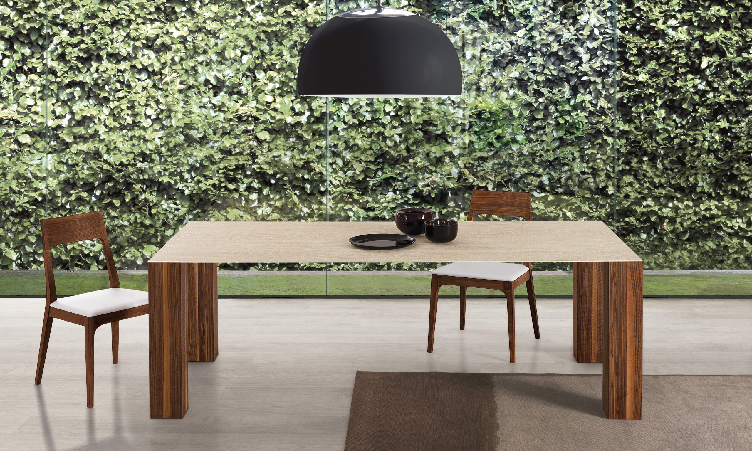 A bright and relaxing bond: this is the result of the union between a Thin table, characterised by essential lines softened by enveloping tones of wood, and our Capri chairs featuring a linear and vintage kind of elegance