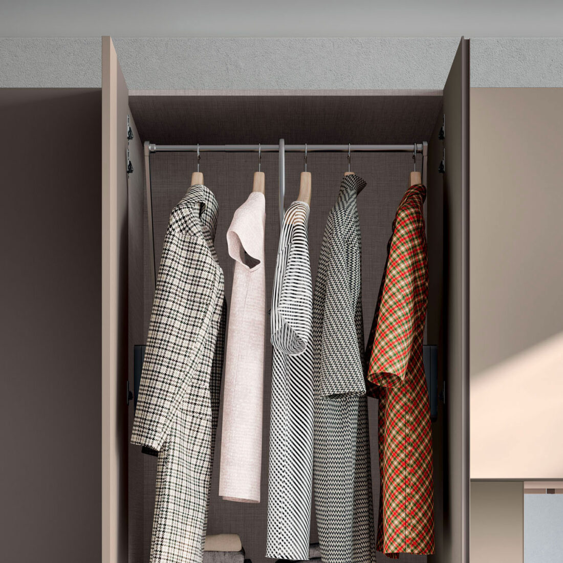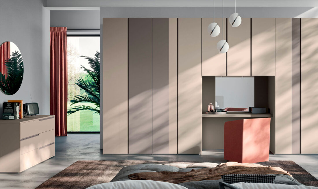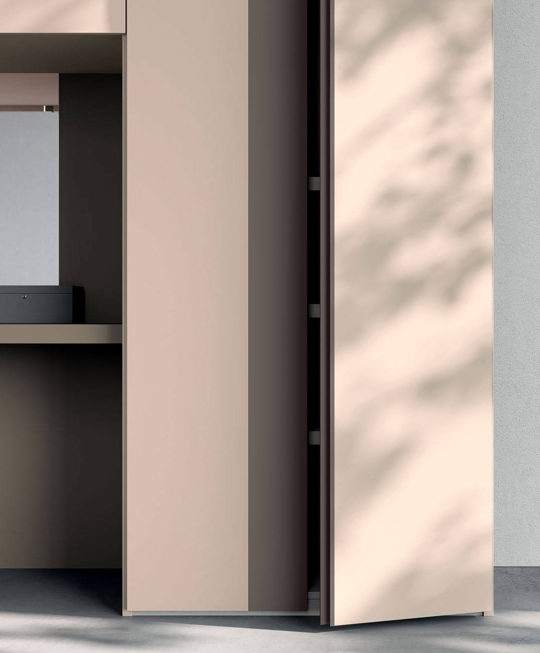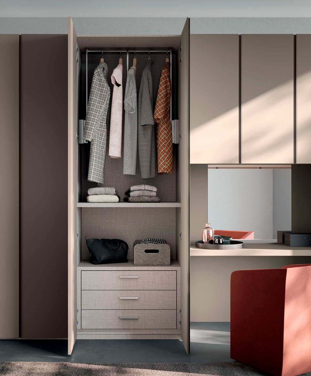 Hinged door wardrobe with Terna door and Filo handle, bridge unit equipped with consolle and mirror with Rita armchair in Jam S154 fabric. Wardrobe equipped with Servetto hanging tube, shelf and Easy drawer pack. Filo handle in Platino lacquered finish.
