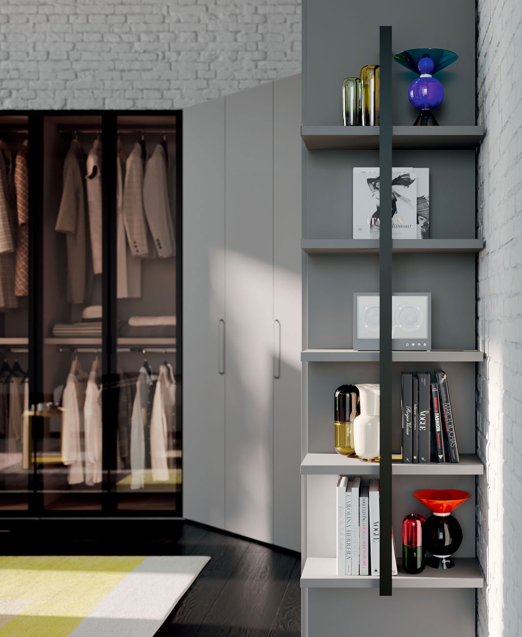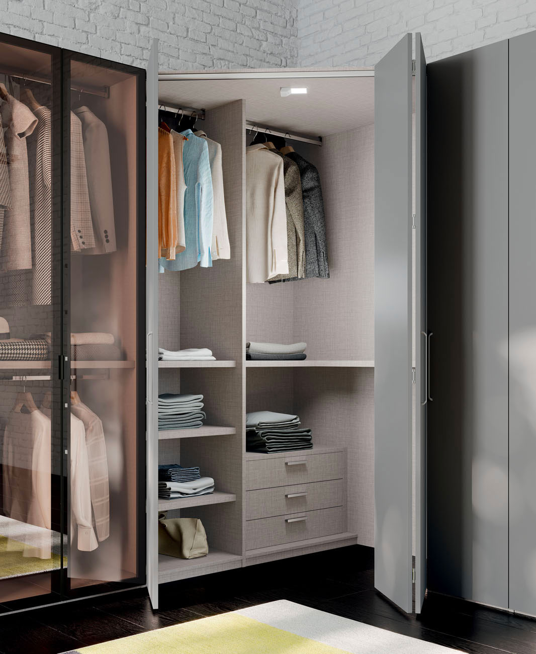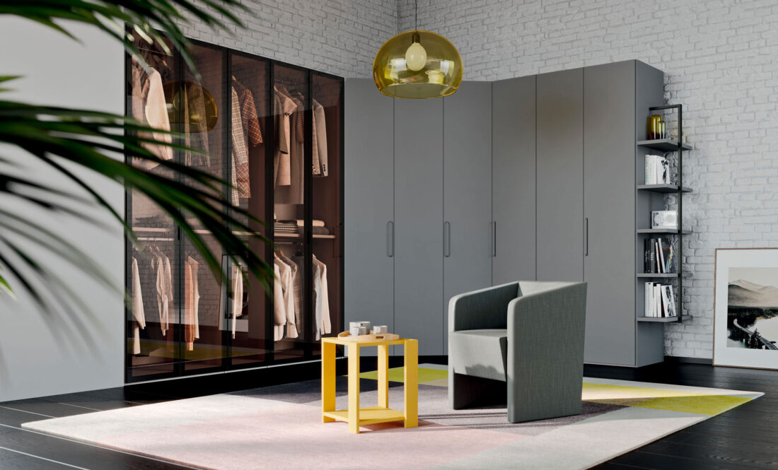 Hinged door wardrobe with Liscia door and M10 handle, Daly glass door and Rita armchair in S201 Favignana fabric. Dressing room closet with folding door, equipped with hanger tubes, shelves, Easy drawer pack and Tech spotlight with presence sensor. Wardrobe equipped with hanger tube, shelves and removable shoe rack. Library terminal and M10 handle in Grigio lacquered finish.