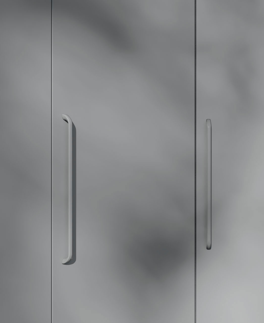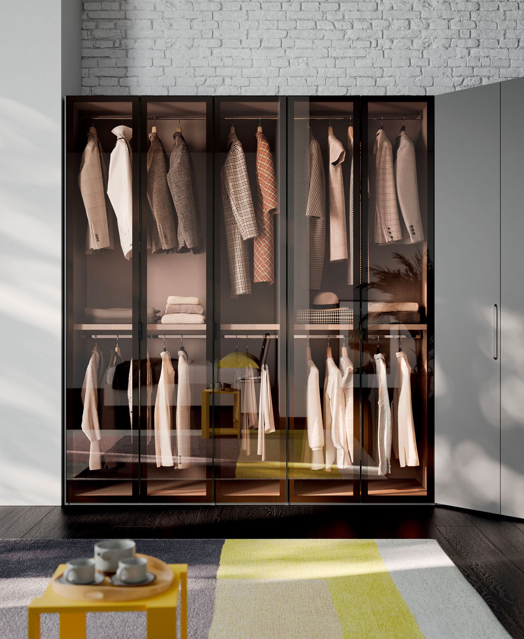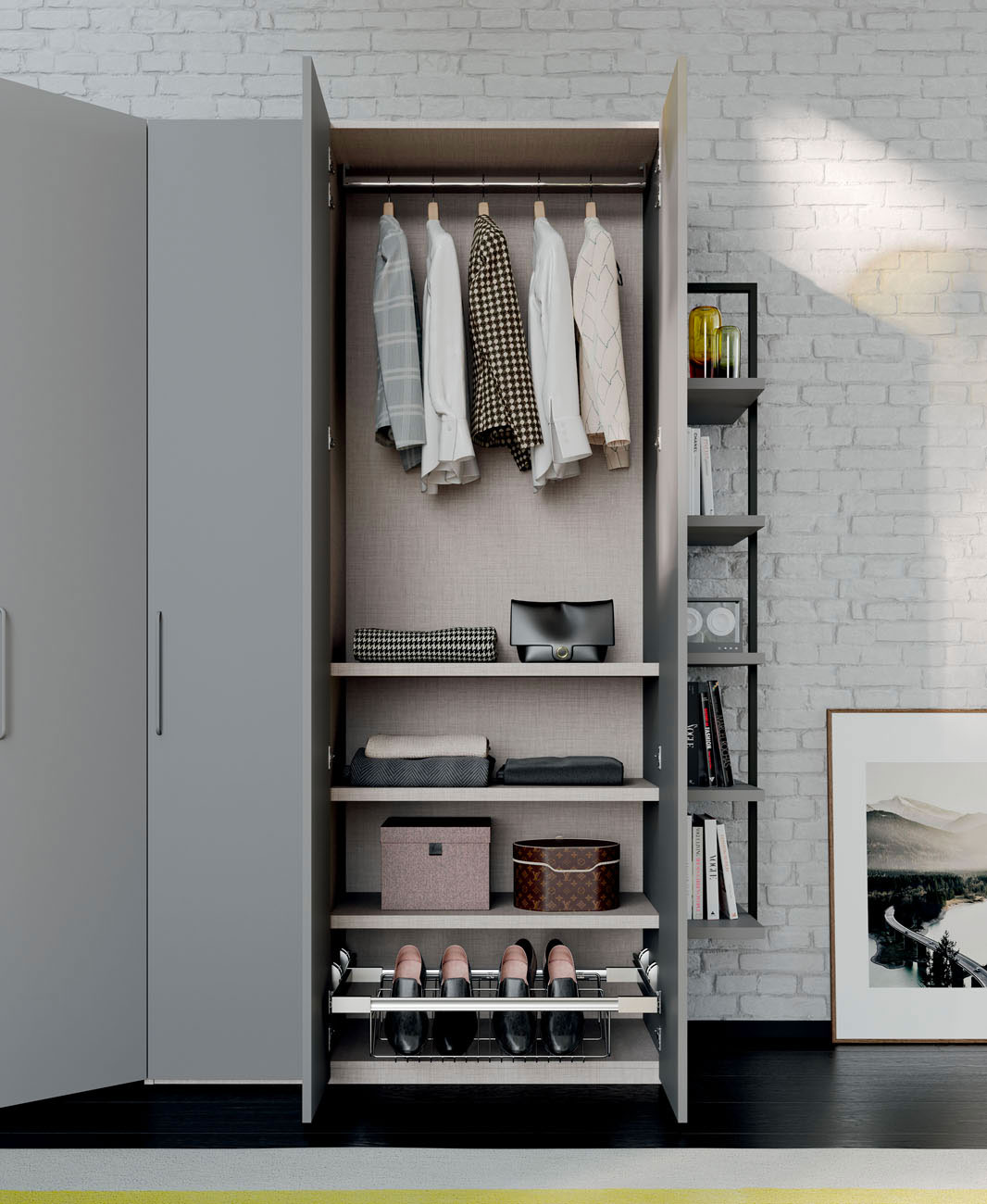 Hinged door wardrobe with Liscia door and M10 handle, Daly glass door and Rita armchair in S201 Favignana fabric. Dressing room closet with folding door, equipped with hanger tubes, shelves, Easy drawer pack and Tech spotlight with presence sensor. Wardrobe equipped with hanger tube, shelves and removable shoe rack. Library terminal and M10 handle in Grigio lacquered finish.