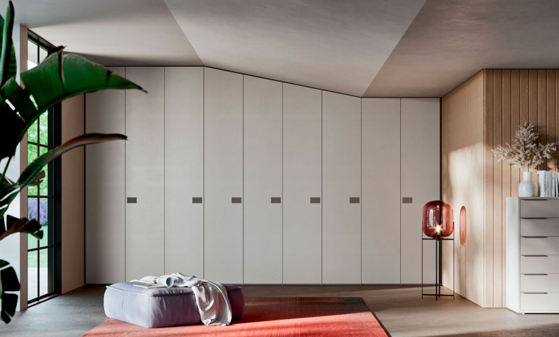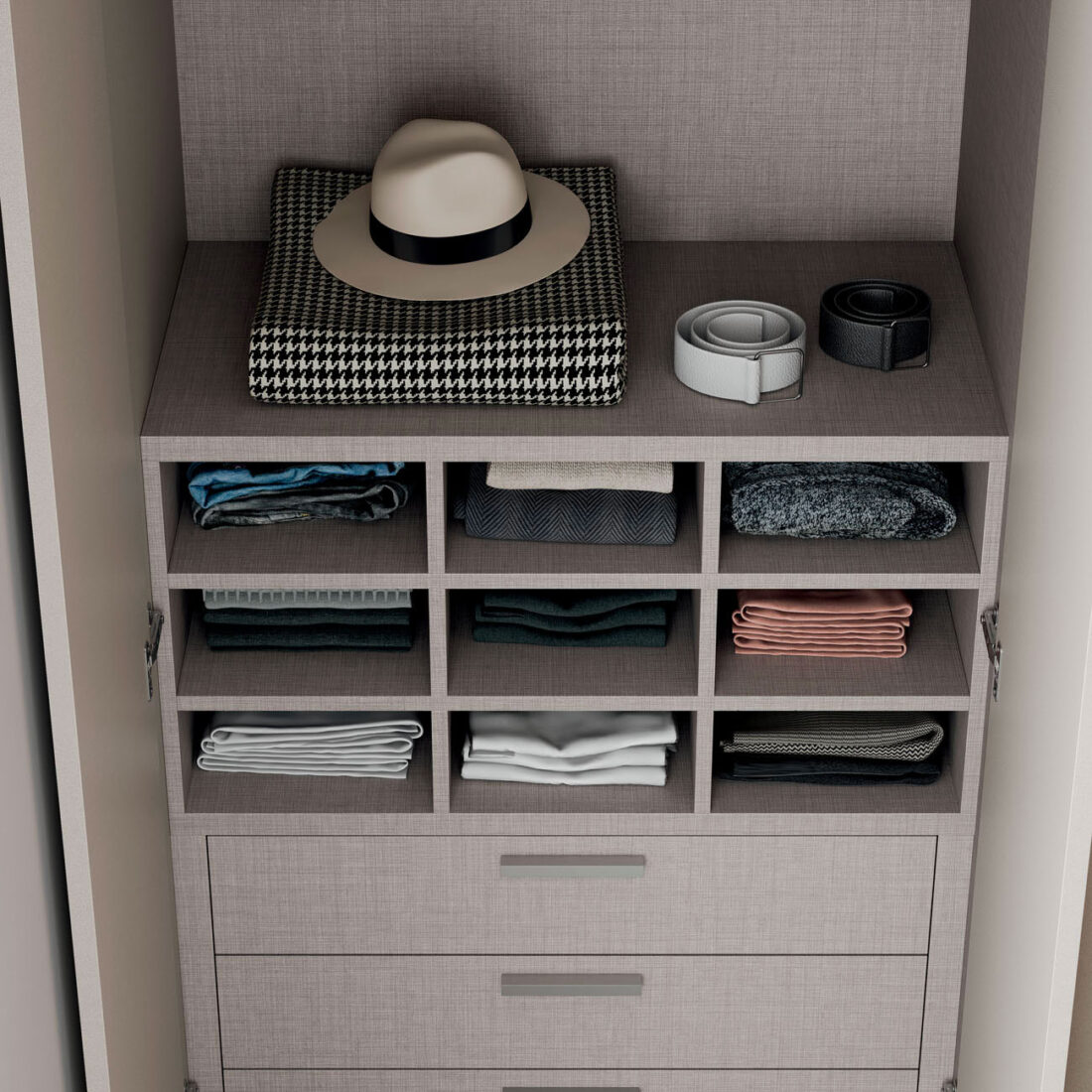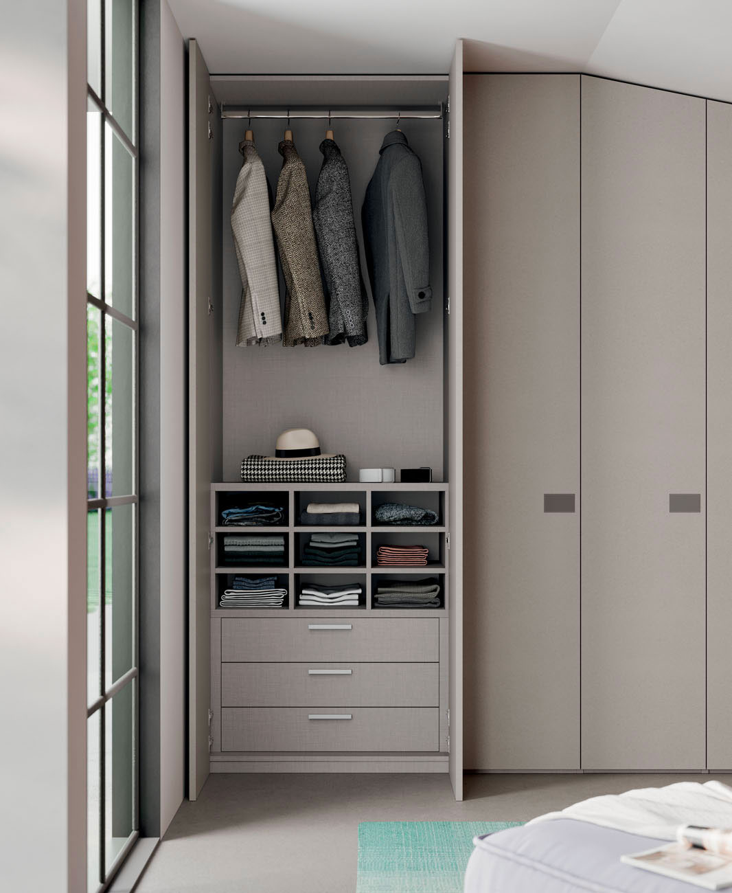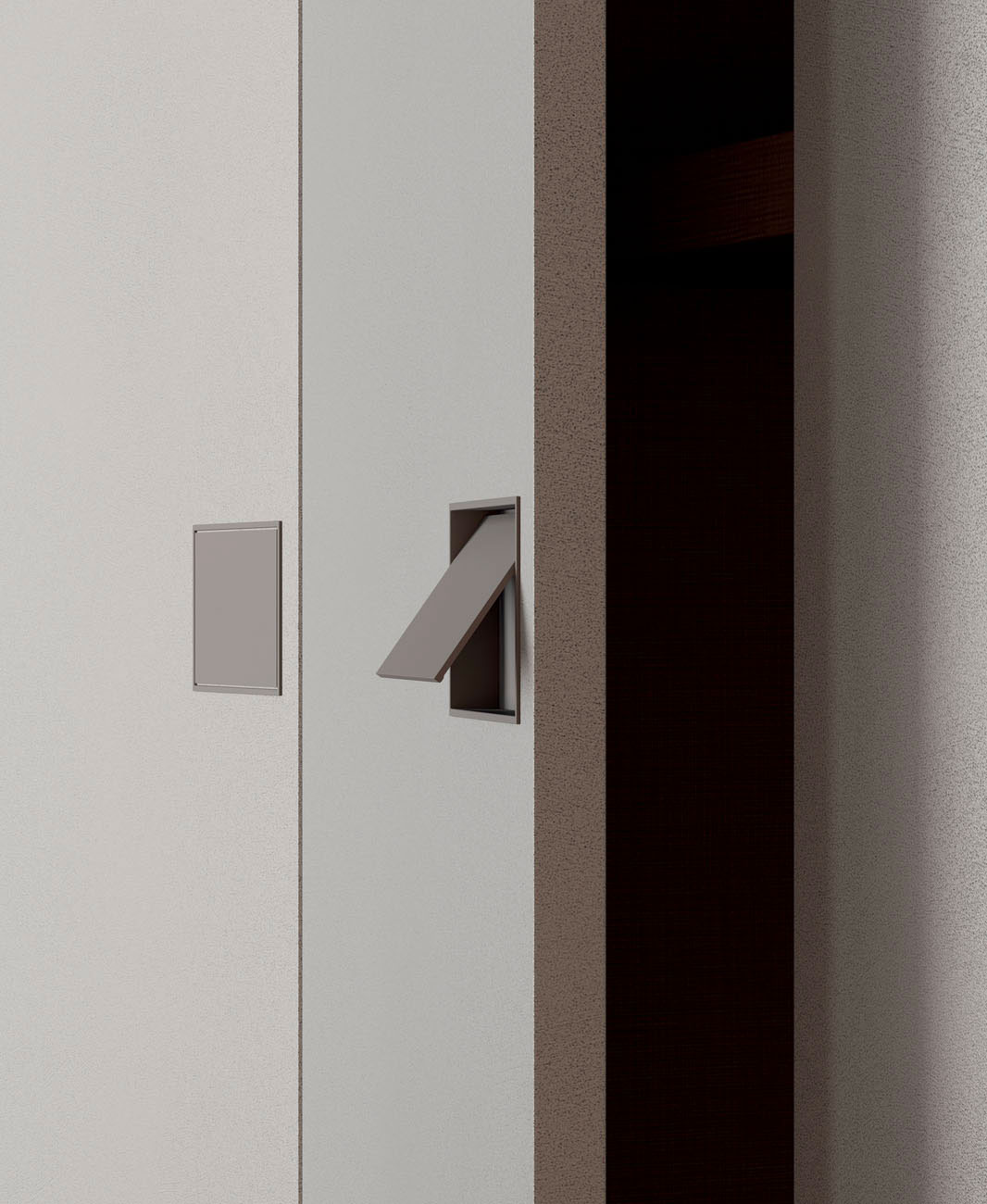 M30 recessed handle in Platino lacquered finish. Wardrobe equipped with hanger tube, Alveare shirt holder and Easy drawer pack.