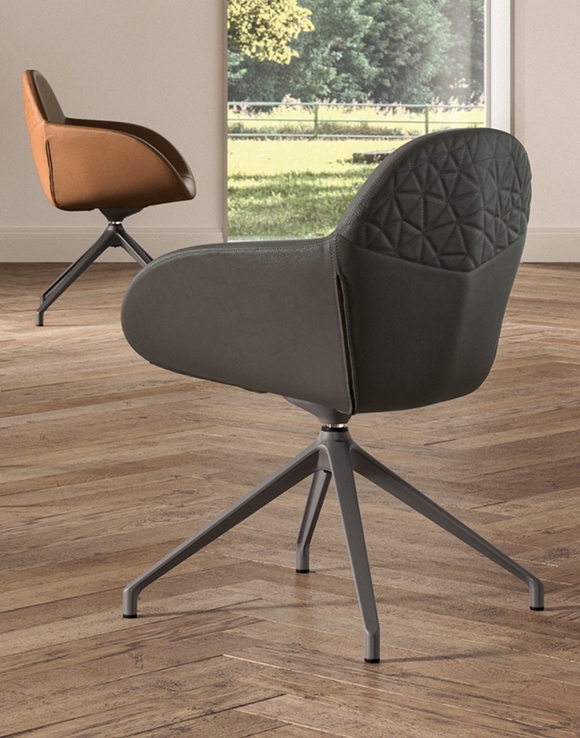 Armchair swivelling with seat covered in soft leather, soft eco leather nabuk or velvet. Metal base.